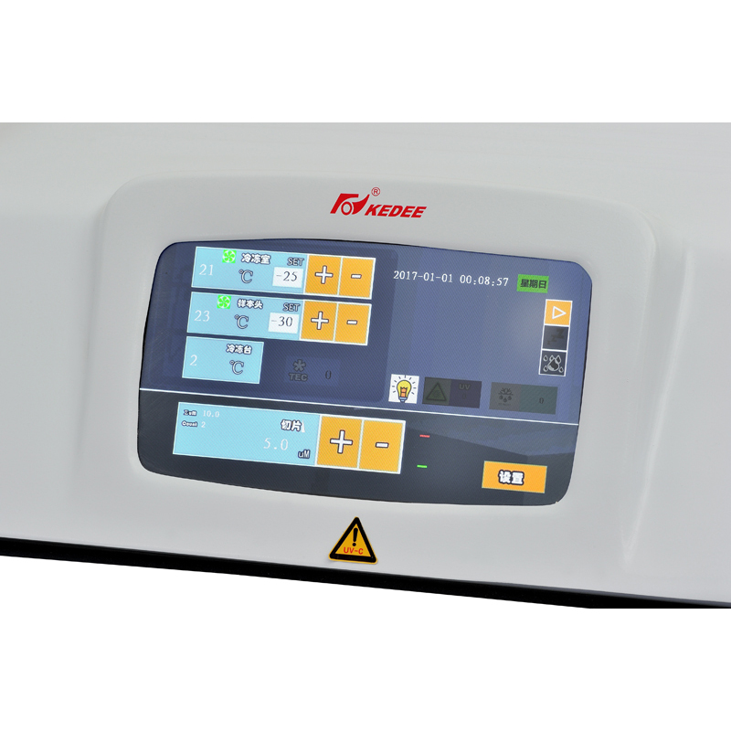 配備10英寸彩色液晶觸摸顯示屏,智能人機(jī)交互界面,操作易懂便捷、簡單,實(shí)時(shí)同屏清晰顯示所有參數(shù)(切片總數(shù)量、切片總厚度、切片厚度、標(biāo)本回縮值、溫度控制狀態(tài)、設(shè)備運(yùn)行狀態(tài)、時(shí)間、溫度、定時(shí)休眠開關(guān)機(jī)、除霜等)